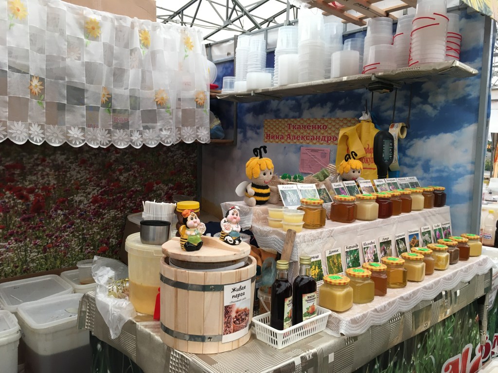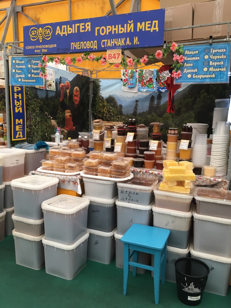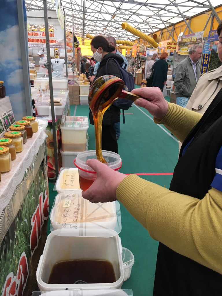 The lovely Kolomenskoye Park, on the south side of Moscow, is currently hosting the annual Honey Fair (until the end of Oct). Inside an enormous yellow tent, next to the children’s funfair, there are row on row of stalls selling honey, honeycomb, wax, honey drink, and all things related. Beekeepers and traders come from all across Russia to sell their honey which is, of course, the best in the world!
