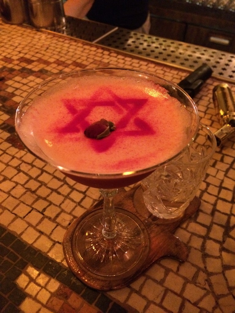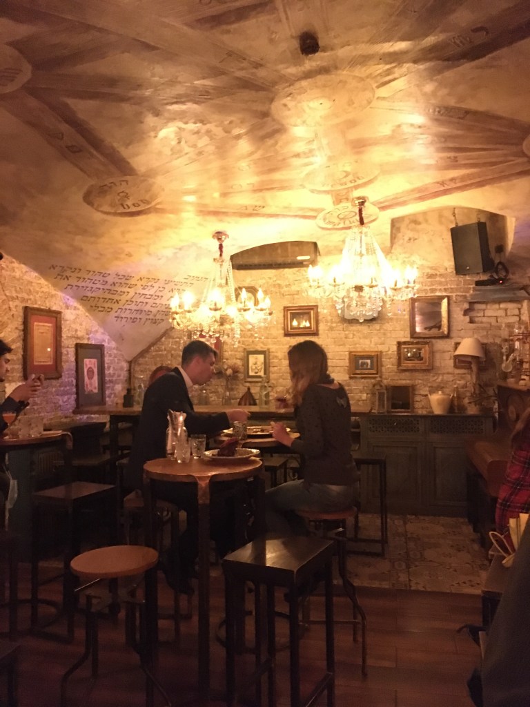 So armed with a small suitcase we arrived after work on Friday evening to find, as promised, that we had been upgraded to a luxurious room with a superb view of the Kremlin and St Basils Cathedral. We then headed out for cocktails to one of the places recommended to us, Mitzva Bar! Through a nondescript side door and down a staircase you find yourself in a small vaulted cellar decorated with Jewish and masonic symbols. They serve a simple, but fairly small, food menu written on a Torah scroll but the main attraction is the cocktails. There is no written menu but they will serve you up any cocktail you name or, if like me, you don’t know the names of many cocktails, you can just ask for a gin based cocktail and after a couple of supplementary question, (sweet? dry? etc) they will serve one up for you. Normally very busy it was not a place that we wanted to stay late as social distancing was impossible in such a small space. So having had a couple of rather nice cocktails, at very reasonable prices, we headed off to another recommendation for food.