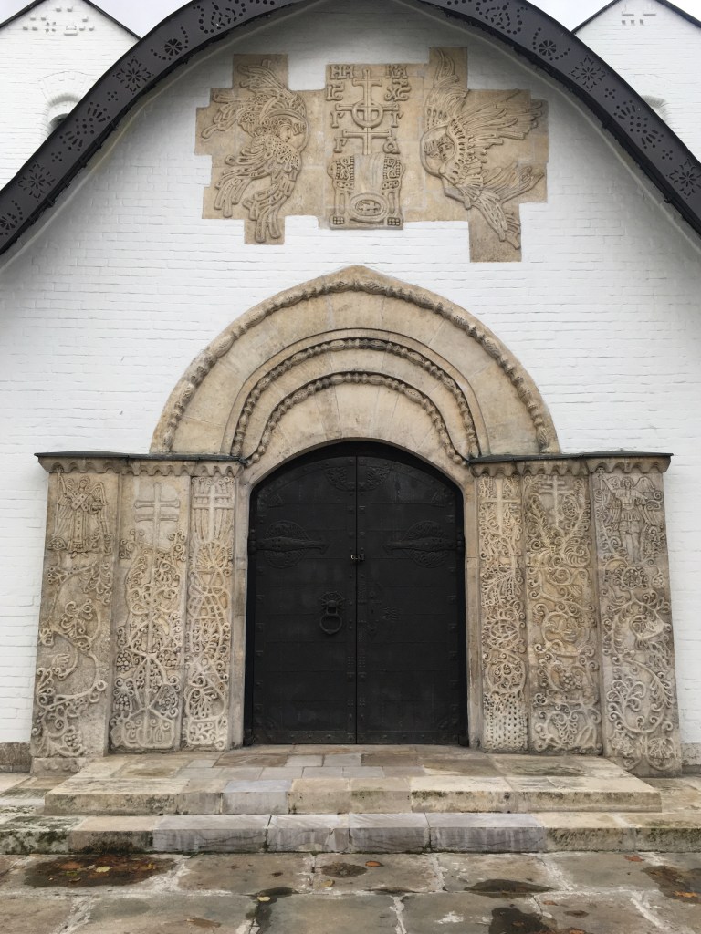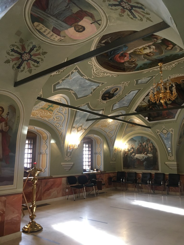 The second favourite was the newest one we saw, the Convent of SS Martha and Mary. Looking, at first glance, like a medieval building, it was in fact built in 1912. It was founded, after her husband had been assassinated, by Duchess Yelizaveta Fyodorovna, sister in law to Tsar Nicholas II and granddaughter of Queen Victoria. Sadly the day after the Tsar and his family had been shot, she and further members of the royal family were pushed down a mine shaft. This did not kill them outright and reportedly after hearing singing the soldiers threw grenades down after them. She is one of 10 modern martyrs who are depicted in statues above the Great West Door of Westminster Abbey. The convent was built in a highly traditional style but with art nouveau features both inside and out.