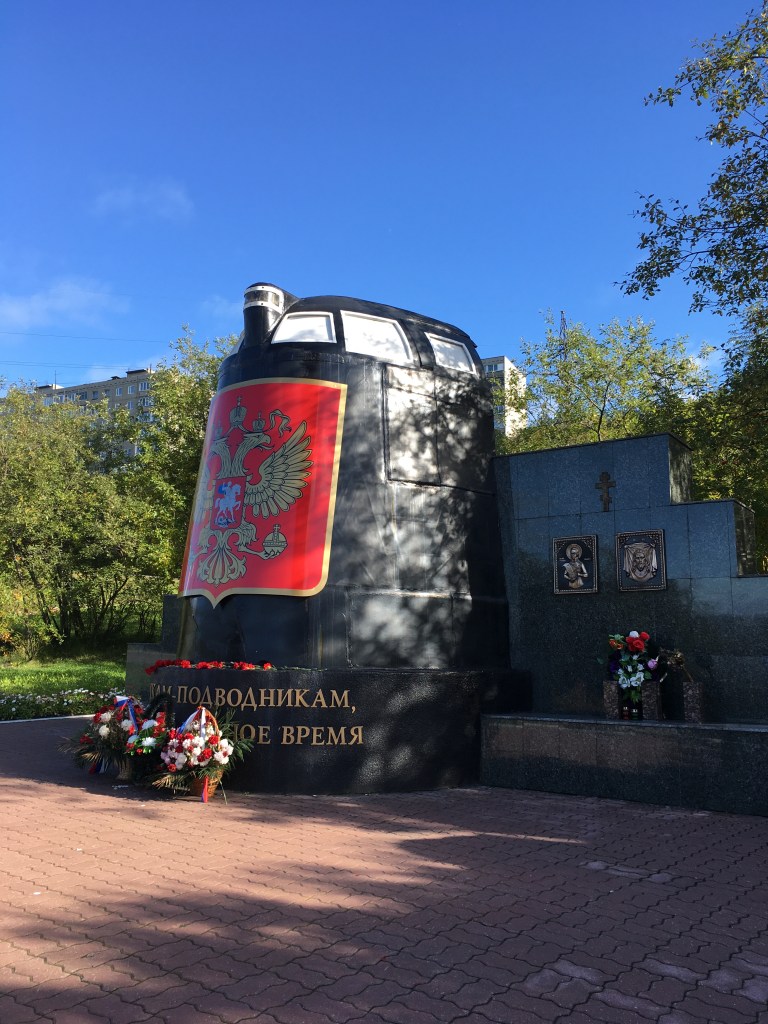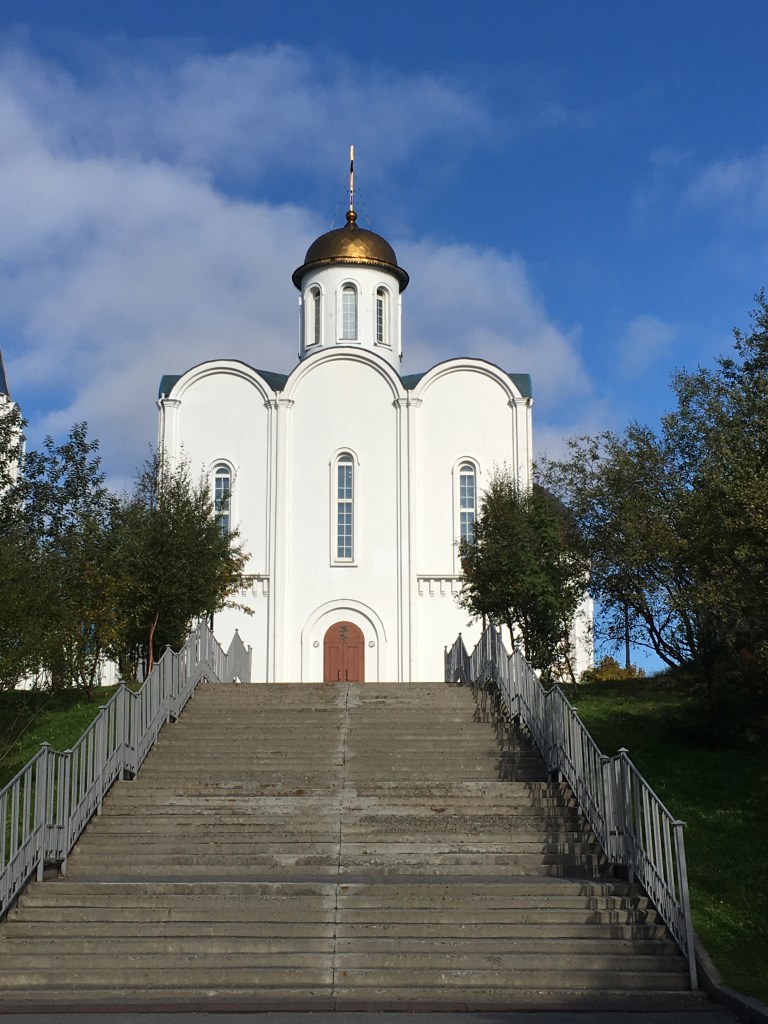 Returning to the town after enjoying the views I walked back through a small memorial park dedicated to sailors lost at sea in peacetime. It contains a church – Church of the Saviour on the Waters – a lighthouse monument and part of the Kursk submarine which sank in 2000 during a naval exercise with all 118 men losing their lives.