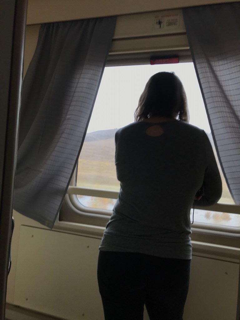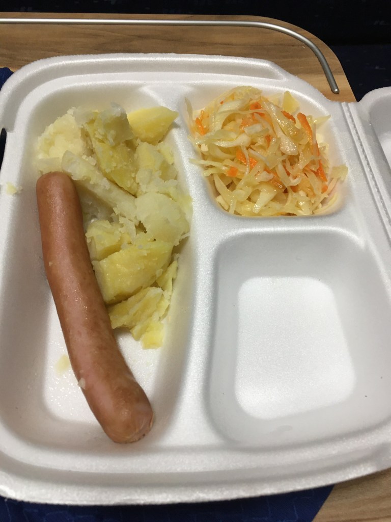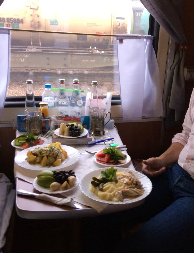 Having boarded the train at midnight we were asked what we wanted for our meal the next day – meat or fish. Himself chose meat and I went for fish. We were then told this would arrive at 10.00am!!! However it wouldn’t have mattered what time of day it was delivered – it was dreadful!! The ‘meat’ was a watery turkey stroganoff and the fish, I was told, was trout but was so dried out and over cooked that it was almost inedible!