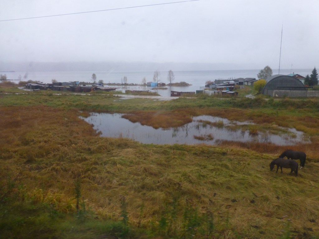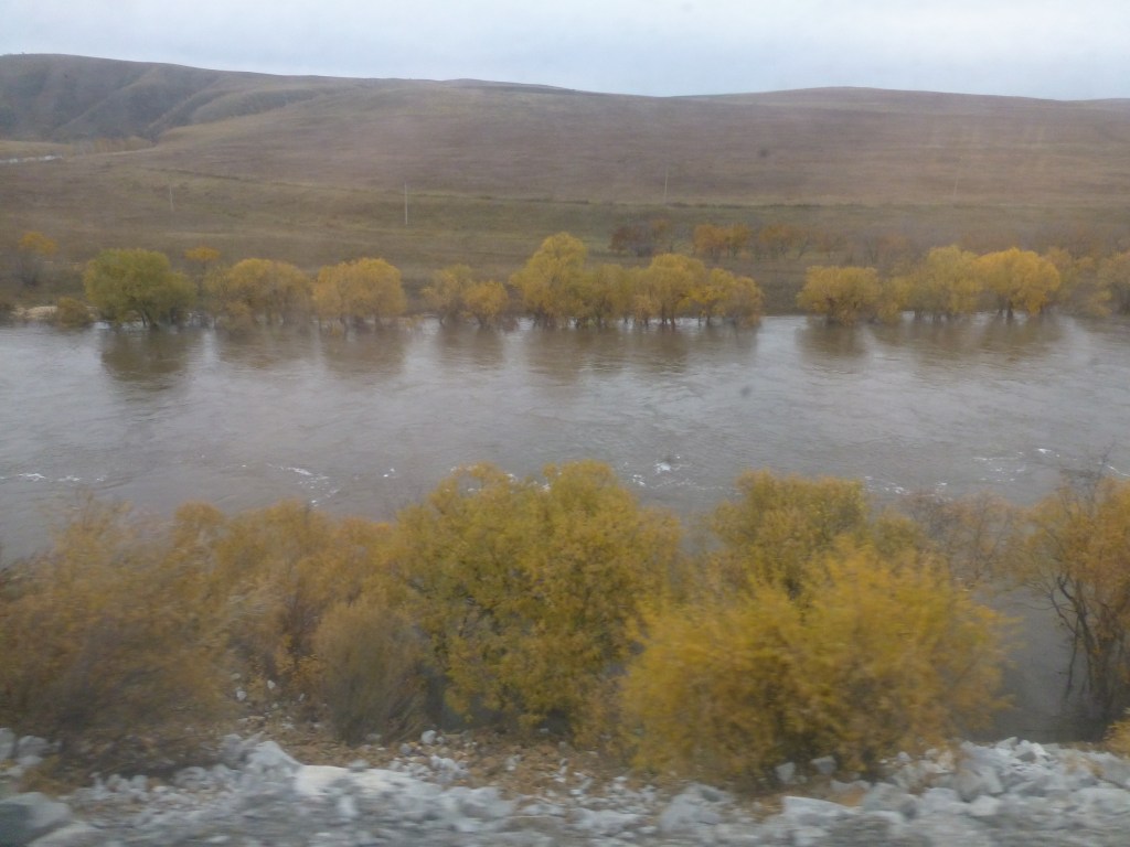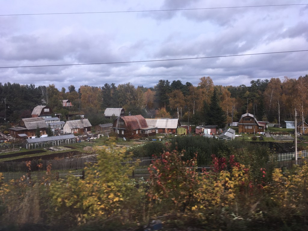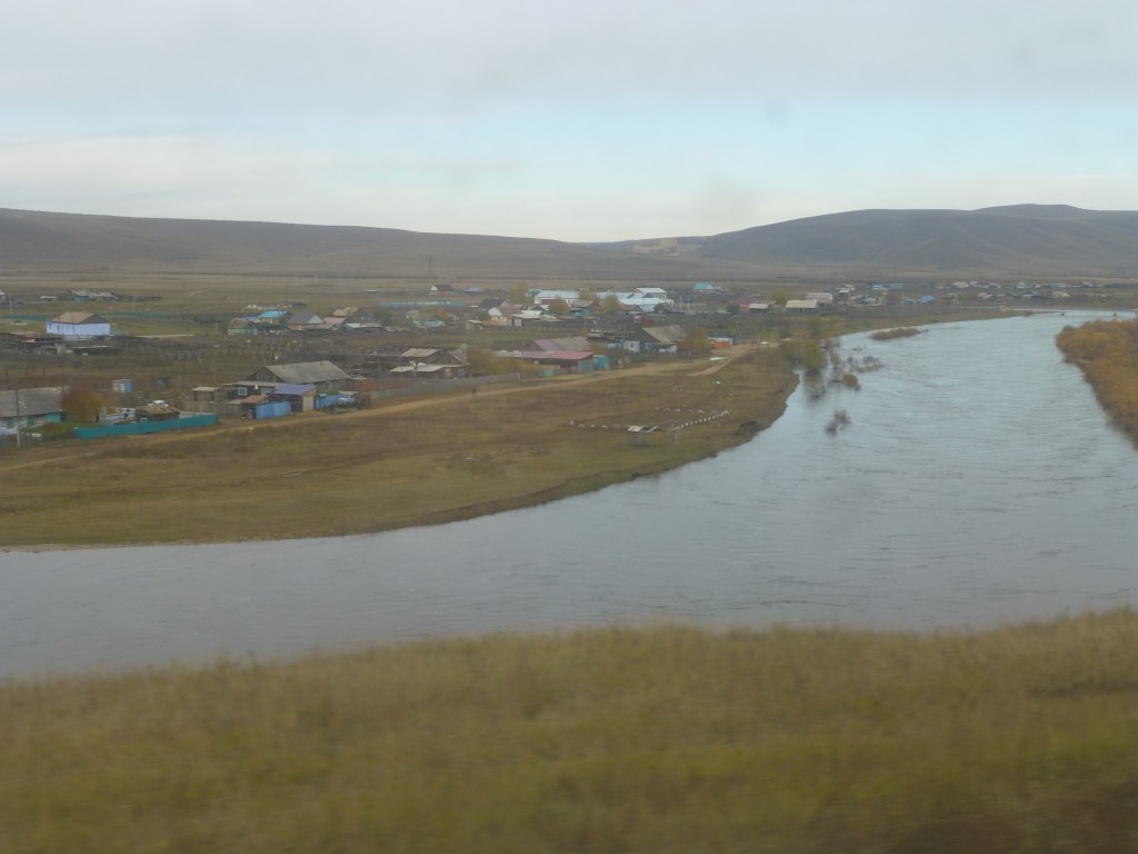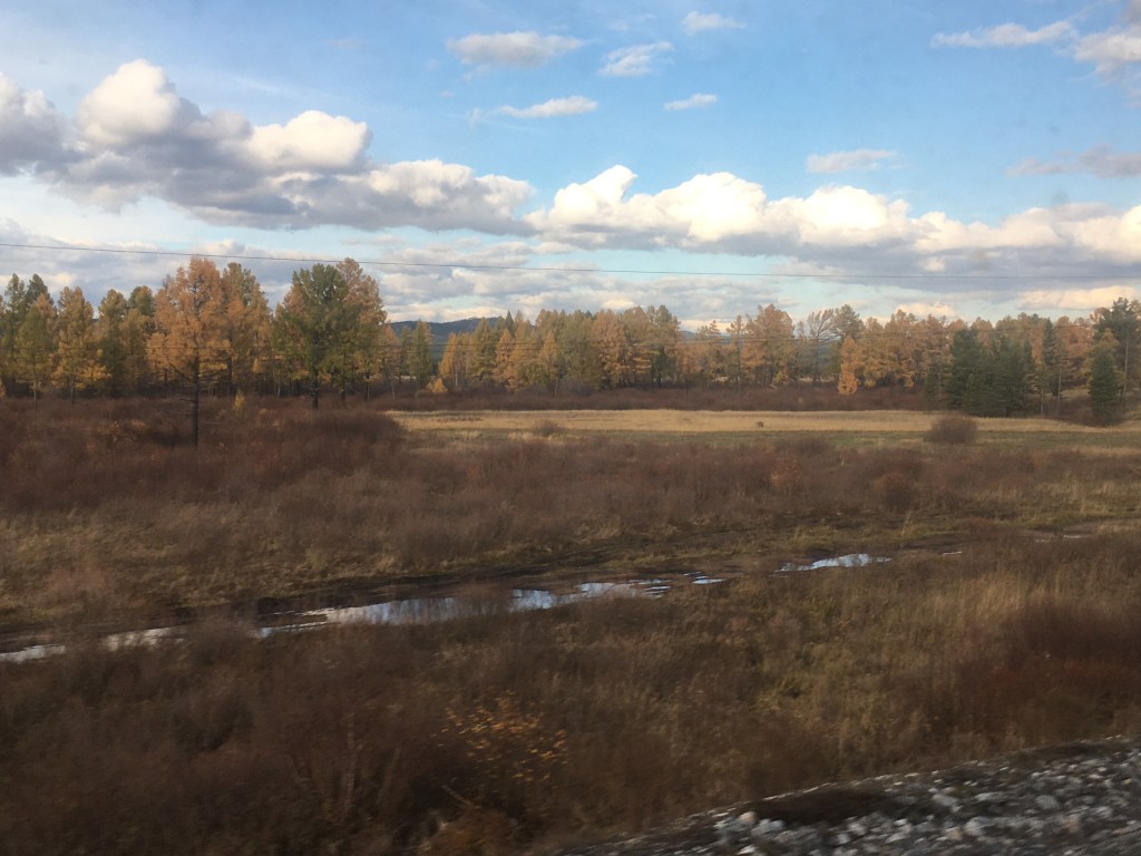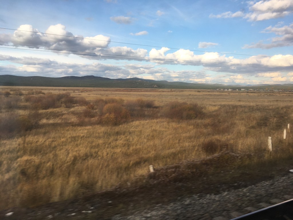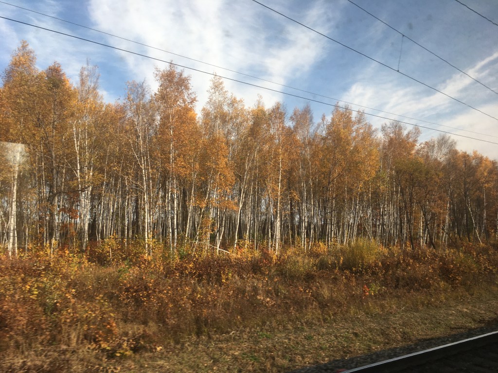 This seems like the right moment to tell you about the passing scenery. The first few days the scenery was trees. Lots of them. Known as taiga here, in the UK we know it as boreal forest, and it consists mainly of a densely packed mixture of conifers and birches. Many of the conifers are larches which in the autumn turn a fabulous golden colour, as do the silver birch. The last section of our trip was mainly tundra; flat open expanses of land that go on forever. In the middle was the prettiest part where we trundled along a couple of river valleys. Here the golden larches and birches were far more spaced out along the river banks and when the autumn sun caught them it was extremely picturesque. Hour after hour we passed trees or tundra interspersed with the occasional village or small town and from time to time a station platform in the middle of absolutely nowhere with no discernible signs of human habitation for miles around.