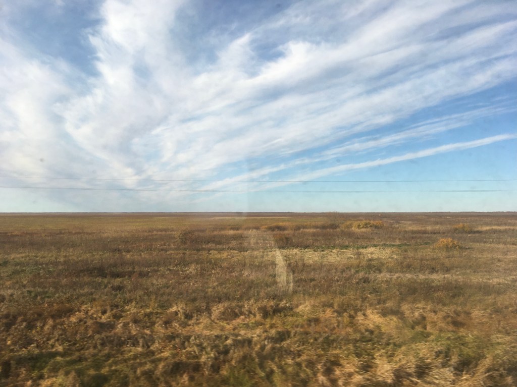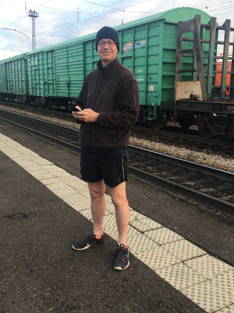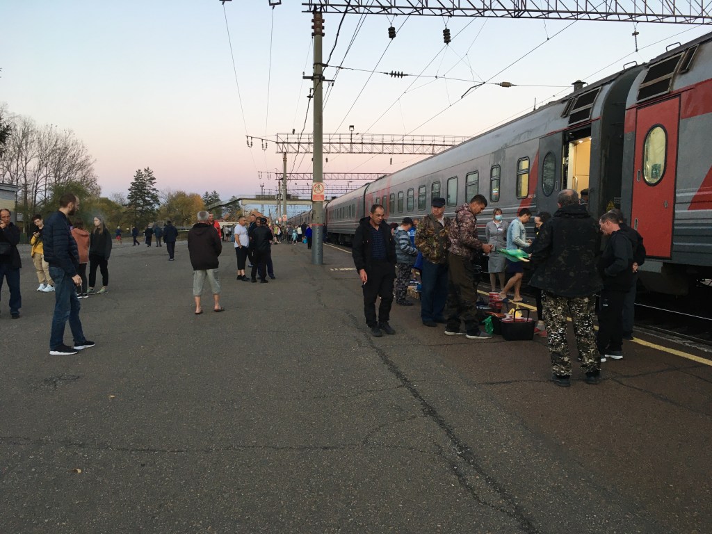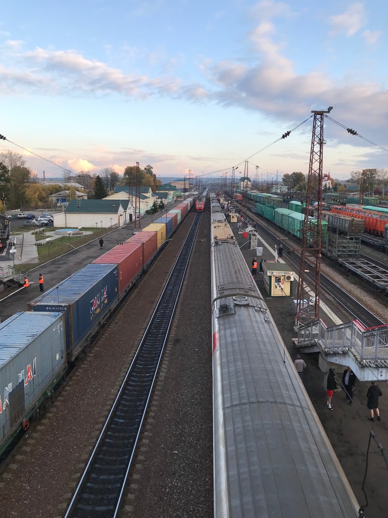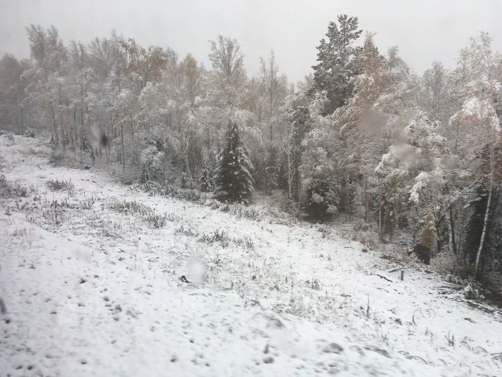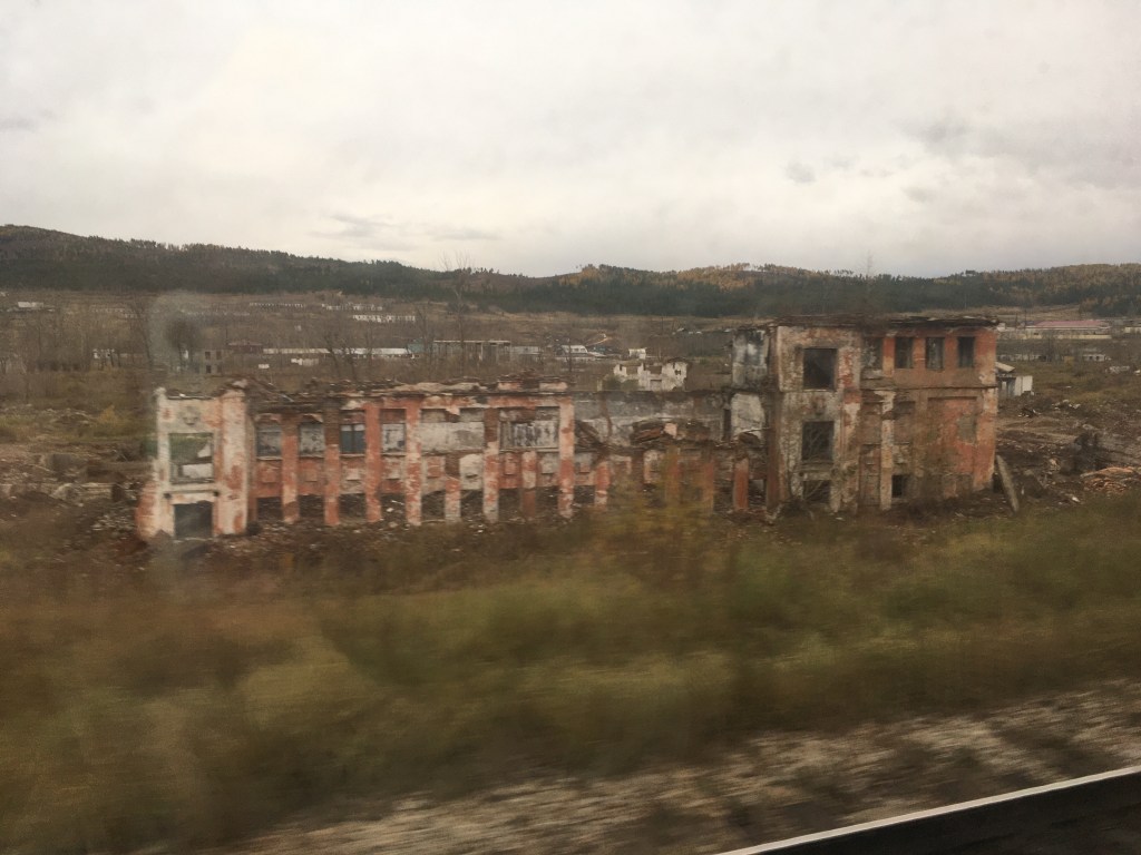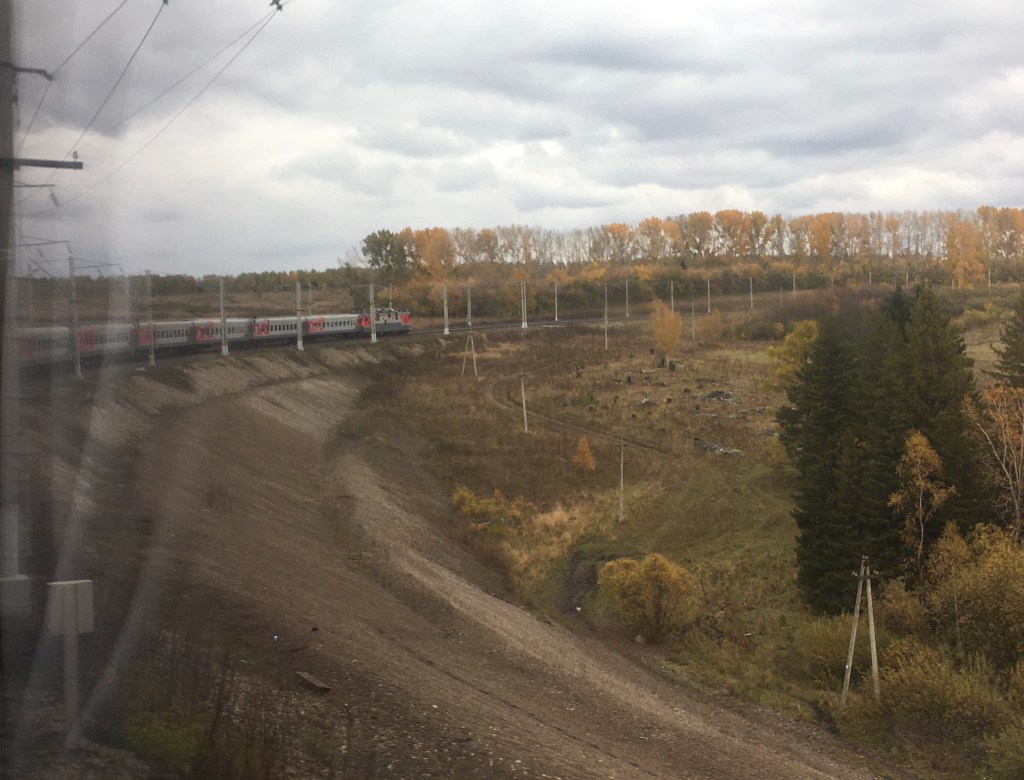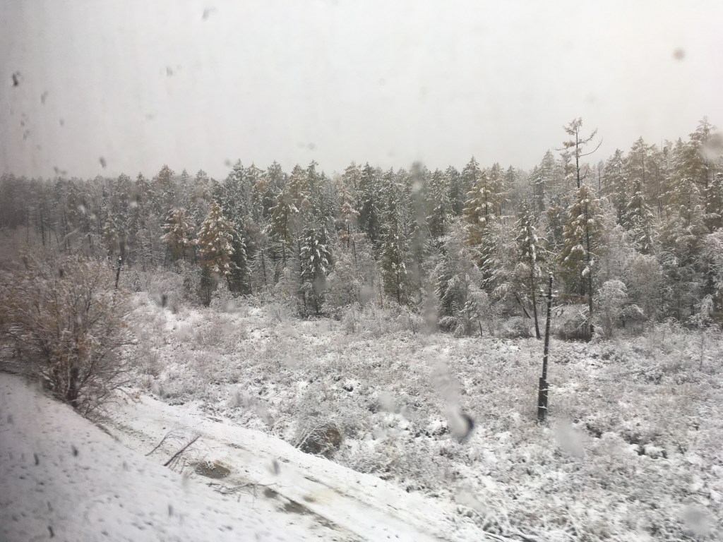 This seems like the right moment to tell you about the passing scenery. The first few days the scenery was trees. Lots of them. Known as taiga here, in the UK we know it as boreal forest, and it consists mainly of a densely packed mixture of conifers and birches. Many of the conifers are larches which in the autumn turn a fabulous golden colour, as do the silver birch. The last section of our trip was mainly tundra; flat open expanses of land that go on forever. In the middle was the prettiest part where we trundled along a couple of river valleys. Here the golden larches and birches were far more spaced out along the river banks and when the autumn sun caught them it was extremely picturesque. Hour after hour we passed trees or tundra interspersed with the occasional village or small town and from time to time a station platform in the middle of absolutely nowhere with no discernible signs of human habitation for miles around.