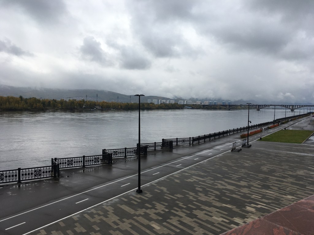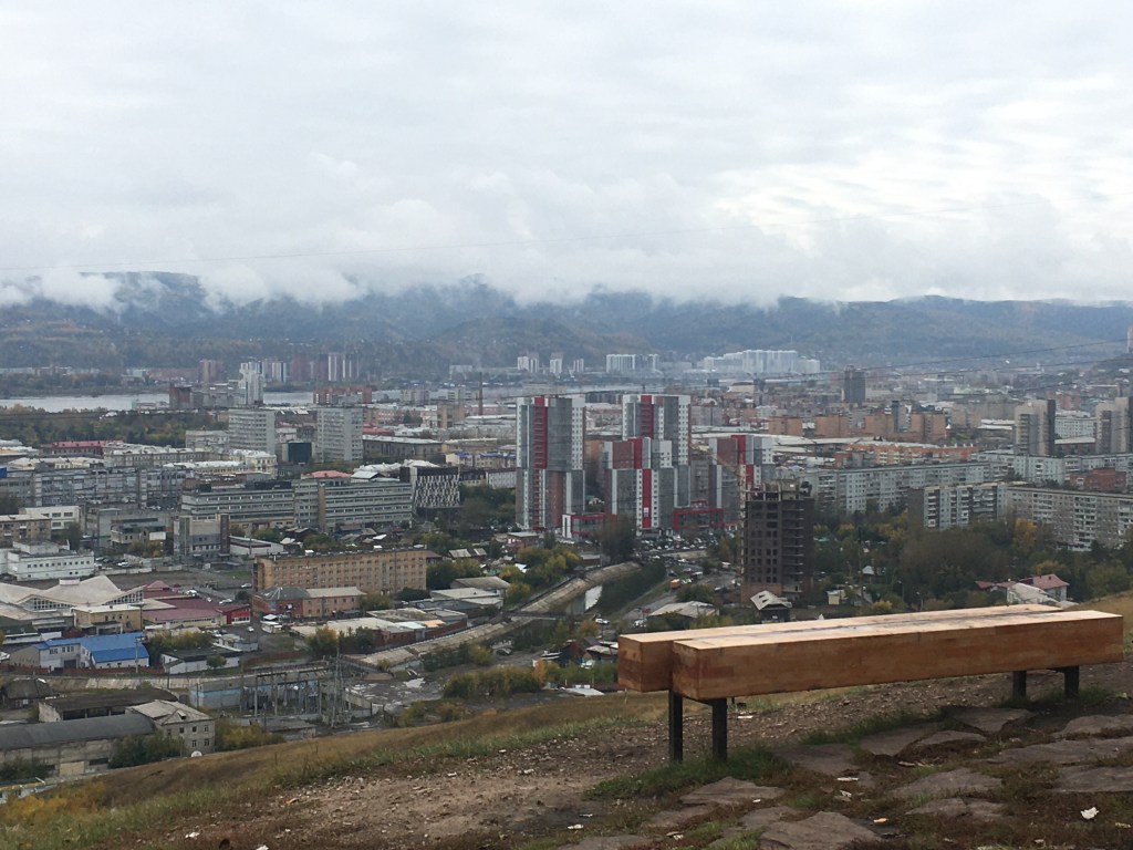 After a relatively good night’s sleep and a breakfast of orange juice and a mediocre type of cake bar (part of our included food) followed shortly by our included meal and after 12 and a half hours on the train we arrived at our next stop – Krasnoyarsk. The main reason for stopping here was to go walking in the nearby Stolby National Park unfortunately a combination of the wrong weather and the wrong clothes put paid to that but we did walk up to the top of one of the nearby hills overlooking the town. We had two nights in the cosy Dom hotel, and some really good food. I must give a special mention to Benedict Café where we had breakfast each day and the restaurant Bar Bulgakov which we stumbled upon by accident at lunch time and liked so much we returned for dinner.